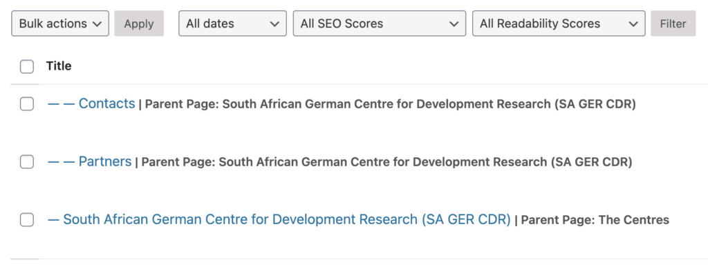 After having your role updated as discussed in the registration section, you will have centre page administration privileges. To see the centre pages you are able to manage, hover over “Pages” in the left hand navigation pane and click on “All Pages”. You will be presented with a list of pages you can edit, usually 3. The main centre page, the contact page and the partners page. Simply click on the title or the “Edit” link to edit the desired centre page.